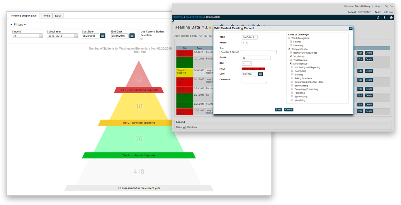 Gain real-time visibility to student progress through reading support level benchmark reporting. This custom solution displays student reading progress clearly, as well as identifies challenges requiring intervention. Results can be displayed and aggregated into dashboards at multiple levels including student, grade, school, as well as district.