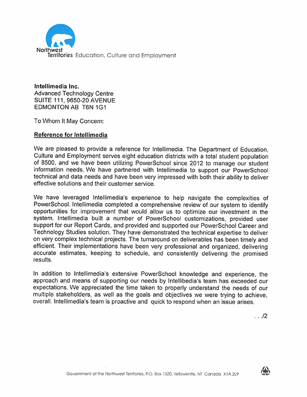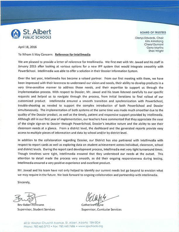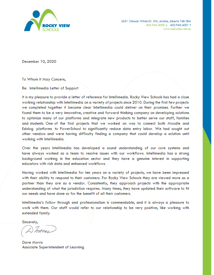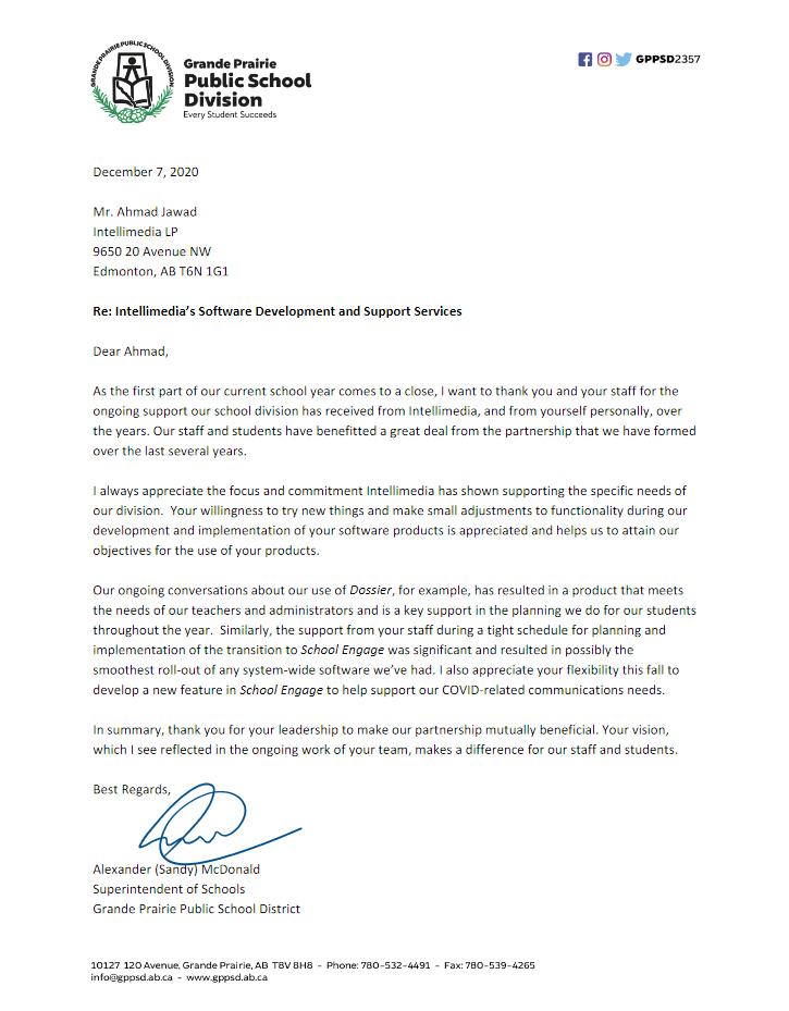 Intellimedia has been a valued partner of the Grande Prairie Public School Division for many years, and I greatly appreciate the relationships we have developed and the support we have received from the Intellimedia team to manage data and information in our division. As our use of Dossier and SchoolEngage have evolved over the years, one constant I especially appreciate has been the commitment of the Intellimedia team to remain focused and responsive on our needs to support continuous improvement in our data management processes. It is clear to me that Intellimedia truly understands our needs and is focused on providing valuable support to our staff.