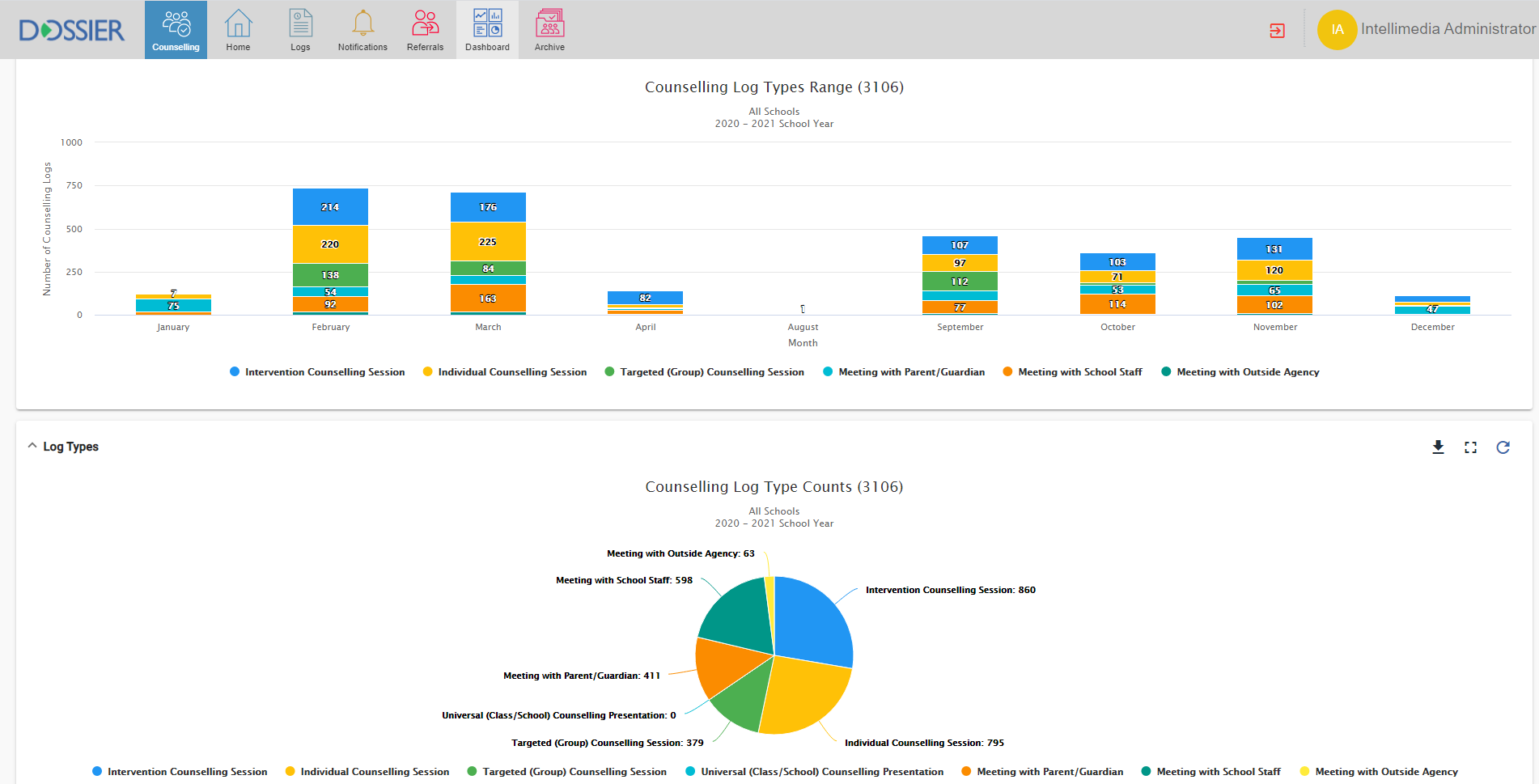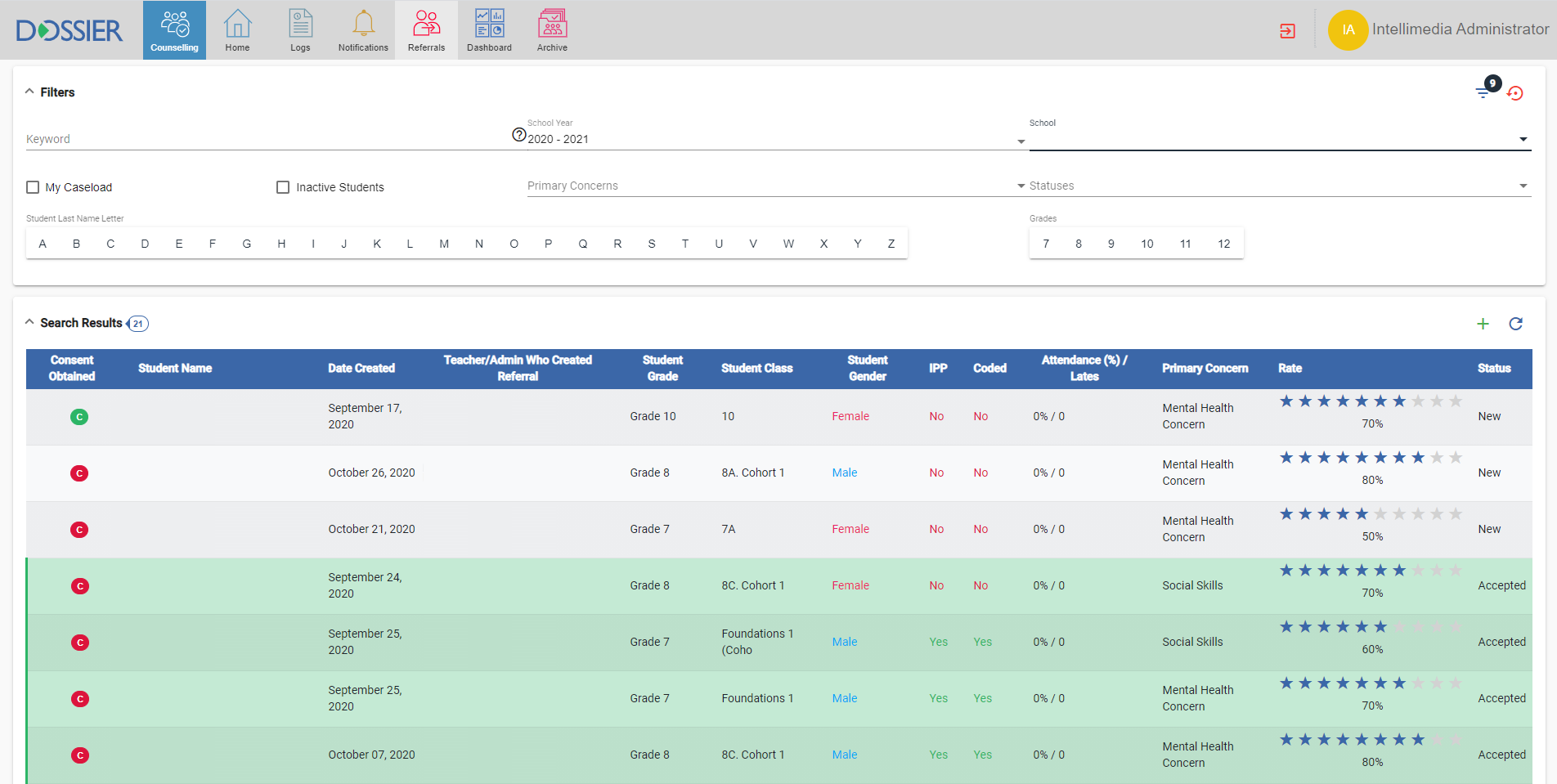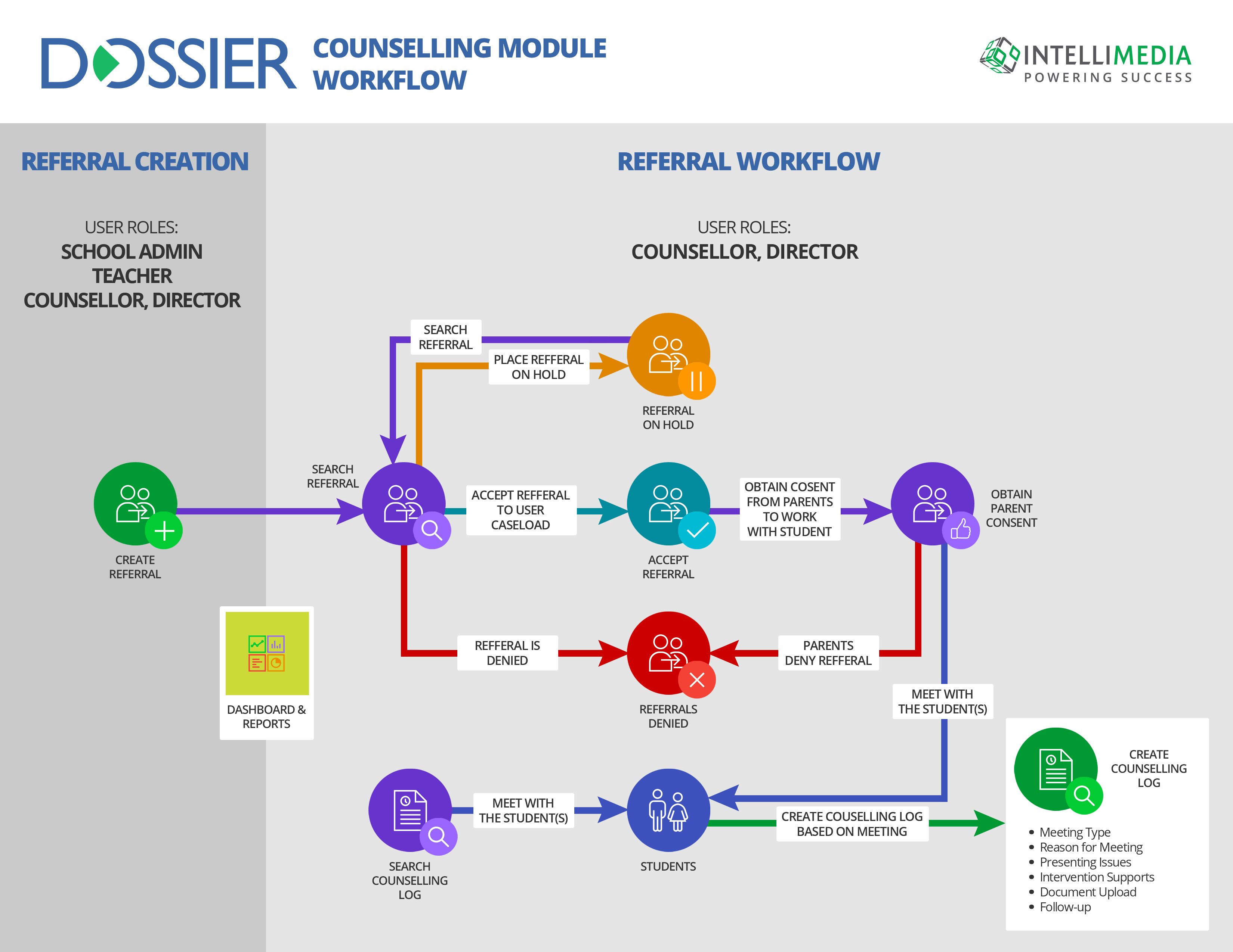 The Dossier Counselling Module allows various entities (Parents, Teachers, Admins, etc.) to refer students to a Counsellor while providing specific information as to the reason of the referral. Counsellors will then accept the referral to their case load and work with the student directly to provide counselling services tailored to that student’s needs. The Counsellor will be able to log each meeting with the student directly through the interface and save specific notes. This will allow a full history of these meetings that the Counsellor and the Director(s) can view at any time in the future.