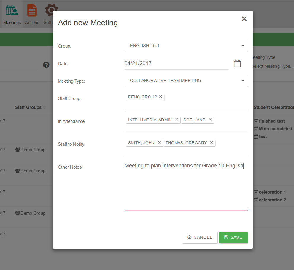 Conduct team meetings to identify and discuss the needs of multiple students, with all notes, actions and interventions determined then saved into individual student profiles.